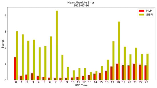 Mean absolute error of the SisPI forecast for 10 July 2019 and the SisPI forecast after bias correction with the MLP model.