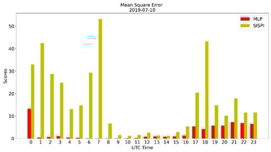 Mean square error of the SisPI forecast for 10 July 2019 and the SisPI forecast after bias correction with the MLP model.