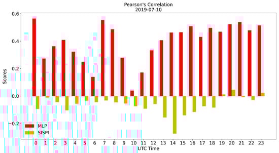 Pearson’s correlation of the SisPI forecast for 10 July 2019 and the SisPI forecast after bias correction with the MLP model.