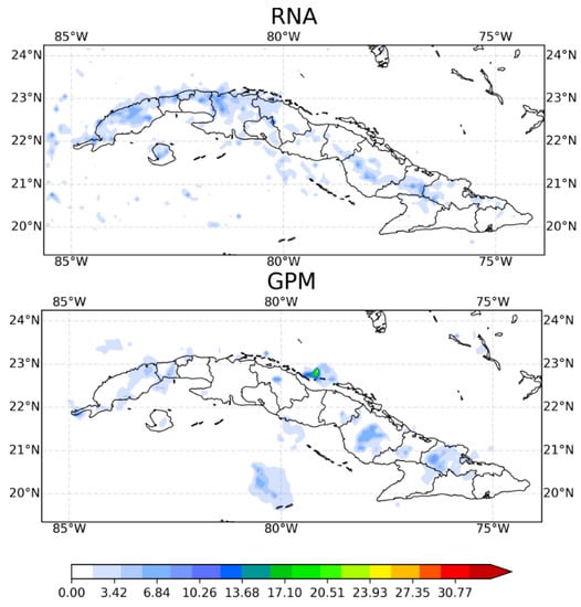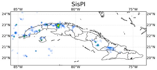 According to the GPM estimate (Figure 10 bottom panel), at 2200 UTC, non-significant values between 6 mm/3 h and 12 mm/3 h occurred over the provinces of Pinar del Río, Artemisa, Havana, Camaguey, and Holguín. SisPI, however, predicts more than 30 mm/3 h in the northern region of Matanzas, which is considered a false alarm. In the rest of the country there is also an overestimation of precipitation values. In this forecast period, the application of the MLP failed to correct any of the errors indicated above and increased the spatial overestimation of precipitation. The above indicates that there is still much work to be done, and that other ANN models with more appropriate characteristics for this type of application should be explored, such as convolutional networks, for example.