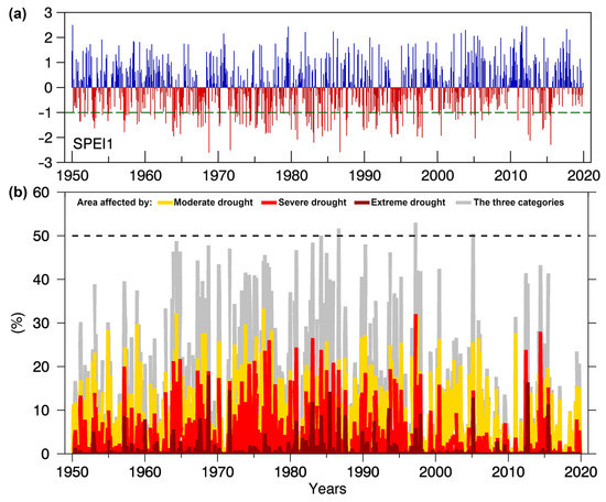 Temporal evolution of the SPEI1 (a) and the area affected by moderate, severe, and extreme drought conditions and their sum (b). Period: 1950–2019.