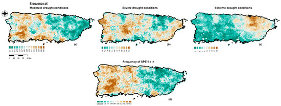 Figure 3a–c show the frequency of moderate, severe, and extreme drought conditions according to the classification of the SPEI1 provided in Table 1, except for mild drought. It is noted that a major frequency of moderate drought prevailed in the western half of the island, but also along the southern coast. For severe drought, the major frequency occurred in the west half of the island, but also along the east and south-east coast. However, the map of extreme drought frequency shows a different pattern, with the highest occurrence of months affected by extreme drought conditions being in the northeast of the island. As expected, the frequency of SPEI1 ≤ −1 (Figure 3d) also showed that the occurrence of drought conditions was more frequent in western mainland Puerto Rico. Indeed, the trade winds from the east and the orographic effects from the Cordillera Central and the Sierra de Cayey mountains in Puerto Rico result in the greater amount of rainfall in the Sierra de Luquillo rainforest, in the eastern part of Puerto Rico [27]. Moreover, during the cyclonic season, the tropical cyclones’ rainfall contribution is also greater in the east-half of the country [14].
