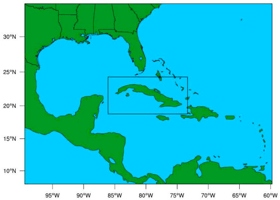 Initial and border conditions were supplied by ERA-Interim reanalysis data (European Center for Medium-Range Weather Forecasts Re-Analysis), with a time resolution of 6 h, approximately 75 km horizontal grid size and 60 vertical levels. These data were obtained from a ground–oceanic–atmospheric coupled model with 4d variational assimilation [23,24,25]. Elevation and land use data were assimilated from the U.S. Geological Survey (USGS) with 30” and ~900 m resolution, which are available from the WRF website: http://www2.mmm.ucar.edu/wrf/users/download/get_sources_wps_geog.html (accessed on 23 September 2013). Figure 1 shows the simulation domain used in this study. It had a spatial resolution of 25 km and covered a region with coordinates between 8°03′ N and 34°03′ N and between 62°09′ W and 99°34′ W. Figure 1 also shows the section of the domain used for evaluation, which surrounds Cuba and the nearby sea areas. Table 1 shows the set of main configuration options for WRF applied in the simulations.