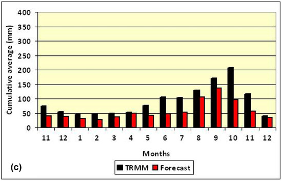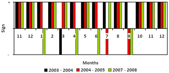 If the month-to-month change was evaluated by assigning a plus sign when both the forecasts and TRMM changed in the same direction, and a minus sign when they changed in opposite directions, the results shown in Figure 6 were obtained. Figure 6 shows that the worst performance occurs in the period 2007–2008, with changes for four months wrongly forecasted. The month with the poorest results was September, which failed in 2004–2005 and 2007–2008. These periods were signed by the presence of tropical storms in the area.