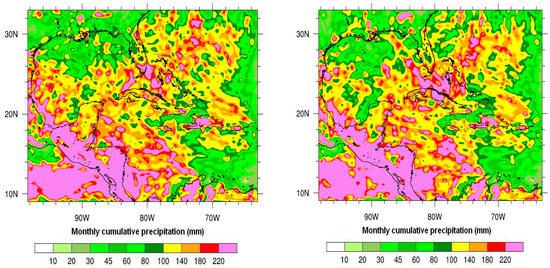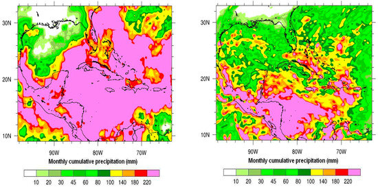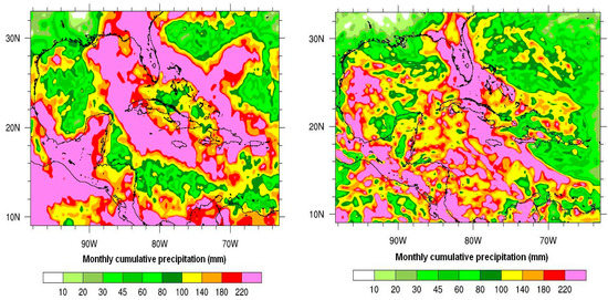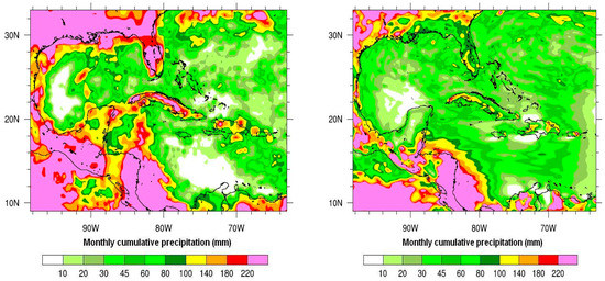 Differences in point-to-point correlations depended very much on the main or most frequent weather system generating precipitation for the month under evaluation, so September 2004, with a correlation of −0.02 was signaled by the presence of Hurricane Ivan. The forecast estimated the hurricane’s trajectory as crossing through the center of Cuba, when, in reality, it maintained a westerly course toward the strait of Yucatan. This produced forecasts of large cumulative totals in places where such values were absent, and vice versa, thus yielding this poor correlation. In Figure 3, the spatial distribution of forecasted and TRMM cumulative means inland are shown.