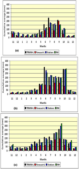 Monthly cumulative precipitation means from points over land for model forecasts, TRMM base, INSMET stations (RE-INSMET) and INRH stations (R-INRH), for experiments started on 1st October: (a) corresponds to period 2003–2004, (b) to 2004–2005 and (c) to 2007–2008.