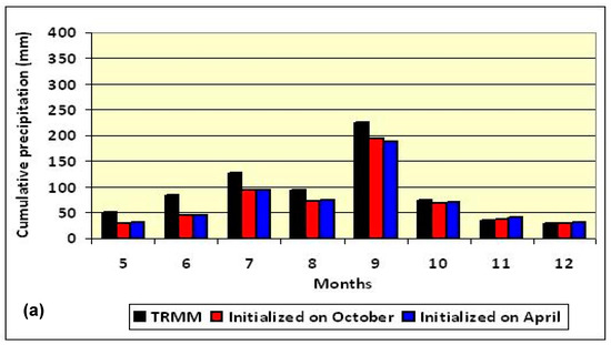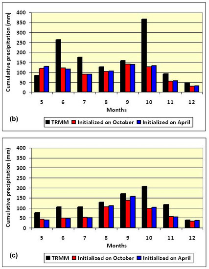 Monthly cumulative precipitation means from model forecasts over the period in which both initializations coincide, and TRMM data: (a) corresponds to 2004, (b) to 2005 and (c) to 2008.