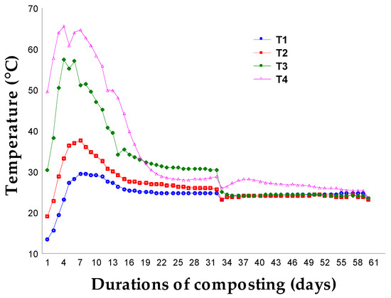 The temperature in each treatment reached its maximum during the composting process with significant differences between the treatments (Figure 1). Variations in the temperature were the result of mixing with different percentages of pelletized wheat straw. The temperature of two treatments (T3 and T4) rapidly reached the thermophilic stage (>50 °C) on days 3 and 2, respectively. T4 reached the maximum thermophilic phase of 65.5 °C in four days and 57.4 °C for T3. The thermophilic phase lasted for 14 days in T4 and 10 days in T3. The maximum temperature for the remaining treatments was 37.6 °C for T2 and 29.55 °C for T1; the temperatures gradually declined until the end of the experiments. Thus, the addition of pelletized wheat straw resulted in more intensive decomposition in the thermophilic phase, but in the cooling phase, the degradation process resulted in less heat in these mixtures due to the depletion of easily degradable organic compounds [10]). T1 (control) and T2 (25% PWS) delayed reaching the thermophilic stage and had no thermophilic phase at all; the maximum temperature was 37.6 °C for T2 and 29.55 °C for the control and lasted to maturity within the mesophilic temperatures. This may have been due to the high moisture in these treatments.