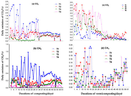 Daily emissions of CO2 and methane CH4 during composting (a,b) and vermicomposting (c,d).