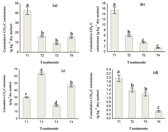 Total cumulative emissions of CO2-C (a) and CH4-C (b) after 60 days of composting, and CO2-C (c) and CH4-C (d) during vermicomposting. The bars indicate the standard error of the mean (n = 3). Different letters indicate significant differences among the treatments (p < 0.05).