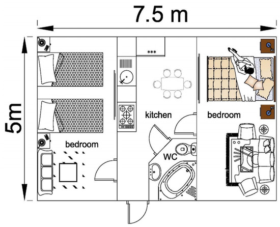 The dimensions of the module-cottage are: length-7.5 m; width-5 m and consists of three rooms with an area of 12.5 m2 each (Figure 1). The height of the module is 3 m. The module is also equipped with a technological unit with an area of 5 m2, which houses equipment for heating, hot water supply and a ventilation system. It also includes energy-saving double-glazed windows, with an area of 1.5 m2 (WxH = 1 × 1.5 m).
