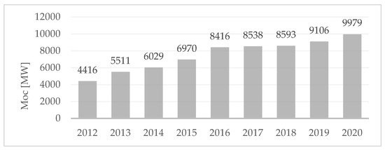 The development of renewable energy is headed by EU and national policy, increasing ecological awareness in society of new, constantly improving unconventional technologies, as well as of the continuously deteriorating conditions of the environment—especially the air. As shown in Figure 1, in Poland there has been a steady increase in the capacity of installed renewable energy for nearly 10 years. As can be noticed, the total installed capacity of RES in Poland in 2020 was more than twice as high as in 2012. The highest growth (21%) was recorded at the turn of 2015 and 2016.