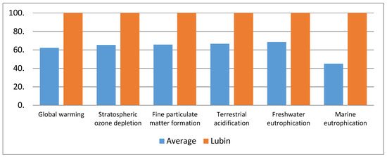 To show the importance of ore grade in terms of environmental impacts, the impact of the exploitation of the Lubin mine (0.92% Cu) was compared to the average ore grade in KGHM mines (1.40% Cu). The impact categories were considered following previously published methodologies [9]: global warming potential, terrestrial acidification, eutrophication, stratospheric ozone depletion, and particulate matter formation. The results are given in Figure 2.