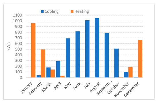 From the simulation result shown in Figure 3, the maximum energy required for cooling is 1047.87 kWh in the month of August, whereas a minimum of 2.47 kWh is used in the month of January. For heating, the maximum energy required is 961.62 kWh in the month of January and zero during the summer months. The simulation is carried out based on the existing model building conditions only.