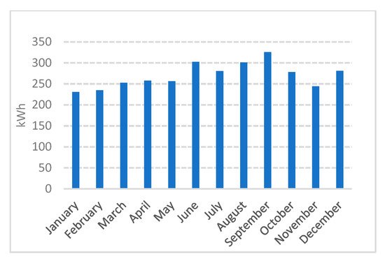 The main supply of energy to the building is only electricity, and Figure 4 shows the monthly electricity bill. The maximum electrical energy consumed is 325.67 kWh, and the minimum is 230.67 kWh.