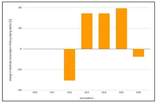 The changes in electricity consumption in the simulation variants are shown in Figure 1. The lowest electricity consumption for pumping station works occurred in variant W2, in which the sectors of the system were connected. This allowed reduce in the pressure by 5 mH2O. The decrease in electricity consumption to the base variant of the simulation was over 34%. The greatest increase in electricity consumption for pumping station works occurred in variant W5. In variant W5, the pressure at the outlet of the pumping station was increased by 5 m H2O. Leaving the pumping system in its basic configuration and connecting the zones did not reduce the electricity consumed by the pumping station.