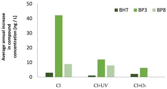 The dependence of the concentration of compounds on the disinfection method used by the facility was observed. In facilities using both UV radiation and ozone disinfection of swimming pool water, the concentrations of the tested micropollutants were lower than in facilities that did not use any disinfection support methods. UV radiation was more effective in removing the antioxidant BHT from water than ozone treatment, but the ozone method was more effective for sunscreens BP3 and BP8. The observation of these dependencies in real samples of pool water was confirmed by experimental laboratory tests, which also showed that, with an increase in exposure time of the compound to UV radiation, the effectiveness of BHT antioxidant removal from the pool water increased significantly. There was also a correlation for sunscreens BP3 and BP8, but the increase in effectiveness over time was smaller. In the case of the ozonation process, the degree of removal of all tested compounds from swimming pool water increased with an increase in the ozone dose.