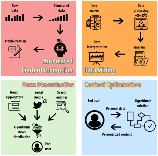 Journalism has changed vastly over the past years and the responsibility for this change hinges mostly on the very significant impact modern technology has had in the news industry. What follows in an analysis and review of the main areas in which computational technology has brought the most notable changes in the field (Figure 1). It should be noted that algorithmic usage in journalism can potentially go far and beyond the categories that are listed here. The following, however, are the ones that appear to have the most relevant services in regard to the modern news industry (Lindén 2017). Specifically, those are:
