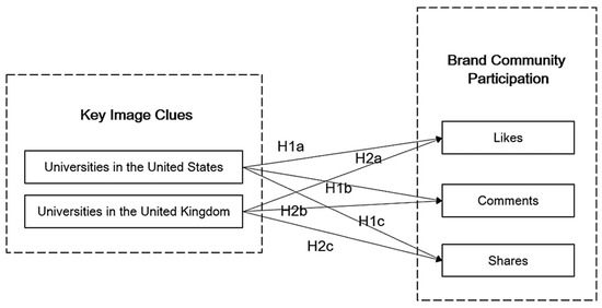 In particular, the click-through rate is more often regarded as an effective measurement of participation behavior (Brodie et al. 2013) and can also be used as a quantitative indicator of online participation (Lehmann et al. 2012). Measurements on Facebook include clicks, likes, comments, sharing and other substantive behaviors (Wallace et al. 2014a). Frequent information sharing creates a supportive environment in which brand information, brand knowledge and relevant experience are shared within the community (Liang et al. 2011). Therefore, stronger social interaction is more likely to result in high-quality information being shared by others. In view of this, this research attempts to understand the so-called information value by examining key (image) clues as a means of evaluating user gratification with information, and based on the above concepts, two central hypotheses are proposed (Figure 1).