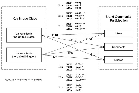 The results show that the key clues of social media significantly affected the public’s response to content and behavior. The hypotheses on information among universities in the United States are supported. The behavior of users (comments) was found to have a significant impact on Random Decision Forests (β = 0.060, p < 0.000), eXtreme Gradient Boosting (β = 0.029, p < 0.002) and AdaBoost (β = 0.028, p < 0.003) made by users. Shares were found to have a significant impact on Random Decision Forests (β = 0.050, p < 0.000), eXtreme Gradient Boosting (β = 0.026, p < 0.007) and AdaBoost (β = 0.055, p < 0.000) (Table 2). Furthermore, the hypotheses on information among universities in the United Kingdom are supported. The behavior of users (likes) was found to have a significant impact on Random Decision Forests (β = −0.029, p < 0.001), eXtreme Gradient Boosting (β = −0.021, p < 0.018) and AdaBoost (β = −0.024, p < 0.008) made by users. Comments were found to have a significant impact on Random Decision Forests (β = 0.051, p < 0.000), eXtreme Gradient Boosting (β = −0.042, p < 0.000) and AdaBoost (β = −0.039, p < 0.000) (Table 3).