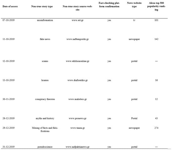 The scope of this study is to reveal the characteristics of fake news in the Greek public sphere, and the extent to which it penetrates news outlets. In more detail, the data categories recorded are the following: postdate, non-true story type, news website link, fact check confirmation link, website name, page type (portal, newspaper, tv, facebook), traffic position, on the official Alexa.com (Alexa 2019) website. Alexa.com top 500 is a measure reference of a site’s online and global traffic and popularity. We have to mention here that the Alexa top 500 list of the most visited websites in Greece has been used in order to categorize non-true stories cases according to the popularity of the medium where a non-true story is found. A sample of the way and method all the above referred data were categorized and analyzed is displayed in the following figure (Figure 1).