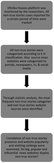 The research procedure follows-up the findings of Lamprou and Antonopoulos (2020) in order to expand the research potential of non-true stories diffusion in the Greek public sphere and reveal more characteristics of the Greek mediascape on the issue of non-true stories. There is a significant gap in research on non-true stories (fake news, misinformation, and other types in Greece). The main steps and phases of the research methodology procedure are generally described in the following scheme (Figure 2):