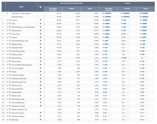 The selection of the sample of branded content department managers of the main national newspapers is based on the study population obtained from the different categories of the ComScore News Ranking, specifically the data from June 2019 (Figure 1). This ranking is a reference for industry professionals as it measures media audiences on different digital platforms.