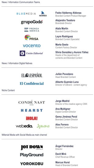 Another notable point regarding possible limitations of the research is that, although it works with a sample that includes the principal media in terms of metrics and size, and thus we can say that it is a significant representation of the Spanish media industry, it is somewhat more limited with respect to digital native media, focusing on distribution in social networks. These media may not be as important in the journalism industry or in terms of brand investment volumes, but they are crucial when it comes to innovation and experimentation within the field of editorial content creation. Media with great influence on younger audiences, such as Cultura Inquieta, Freeda, Brut and the leading international names like Vice and Buzzfeed, are also real laboratories for innovation, where new editorial products are constantly being explored along with new forms of collaboration with brands. If these were included in the research work, interesting new contributions could be achieved. This has been taken into account and will be addressed in future research.