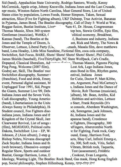 Yet other students were more experimental in their approach. For example, one student created a new Facebook profile in order to see what ads topics would be associated with a new account. They entered only information about the school they attend, their major, a love for pizza, and uploaded photographs of zebras. This resulted in the following list of ads topics: Music theory, Zebra Print, WomenFreebies, pluto, CollegeInsider.com Postseason Tournament, Ford Thunderbird, Graphics Interchange Format, Obama sucks, All- news radio, Zebra, Taylor Swift discography, Southern Charm, Mellow Mushroom, Tosco Corporation, Appalachia Service Project, and Monopoly. This approach might be seen as following the recommendation by Galloway and Thacker (