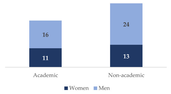 As for the participants’ profiles, of the 64 experts, 37.5% were academics, while 62.5% did not come from an academic or scientific sphere. This latter group included professionals from the field of business, journalists, as well as activists and political representatives. The presence of women was greater in the academic sphere (48.83%) than among non-academics (40%) (Figure 1).