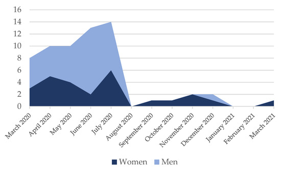 Meanwhile, the qualitative analysis of the data indicates a much more extensive gap, since during the first five months of the pandemic, when the topic was of greatest social interest and had a much greater information impact, the gap spread to 27.28 points. As interest declined, along with the volume of publications, the number of women increased. This could be affected by the fact that caring duties during lockdown mainly fell to women (Myers et al. 2020), because of the existence of greater difficulties in reconciling family and work life (Krukowski et al. 2021; Deryugina et al. 2021), or that men might opt for higher-profile topics with more publishable characteristics (Lerchenmueller et al. 2019).