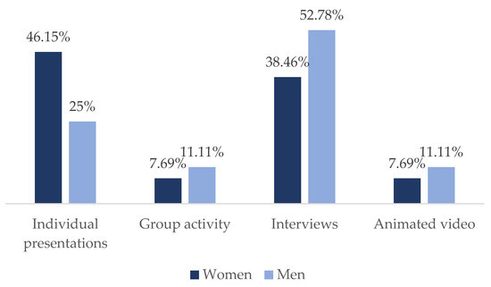 As may be seen, women were proportionally more involved in talks, while men were, to a greater extent, the focus of interviews (Figure 3).