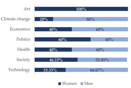 As may be seen in the results (Figure 4), women had a greater presence in topics such as art, politics, and society, but less so in climate change, technology, and health.