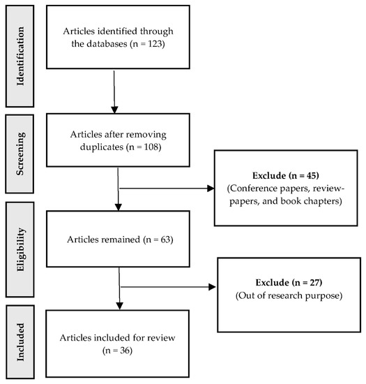In line with this, by closely reading the titles, abstracts, and keywords in the first round of the literature search, and after removing the duplicates, 108 relevant scholarly documents were collected. We then excluded 45 papers (e.g., conference papers, book chapters, and non-empirical papers). The remaining 63 papers were closely studied, and 27 were further excluded as they fell outside of our research purpose and chosen definition of media work as declared above. Finally, 36 peer-reviewed papers, all indexed by Scopus and published between 2006 and 2020, were selected for conducting our literature review.