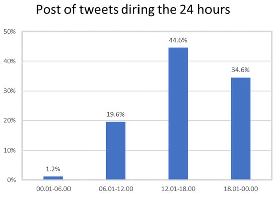 Based on the 24-h distribution of tweets (Figure 1), the analysis revealed that the six-hour period that accounts for the highest percentage of posts is the 12:01–18:00 period, with a total of 3177 tweets (44.6%). The 00:01–06:00, time frame accounts for the lowest frequency of posts with merely 82 tweets (1.2%).