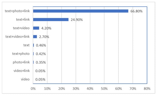 Our study follows the analysis of the types of tweets selected by the public broadcasting corporation to ascertain through which available tools the corporation communicates its tweets to the public. It was found that the overwhelming majority of tweets include text with a photo or a link, the total being 4760 (66.8%), followed by tweets with text and a link, amounting to 1774 tweets (24.9%) (Figure 2). Much lower percentages are observed in the case of tweets accompanied by text and video which amount to 297 (4.2%) tweets.