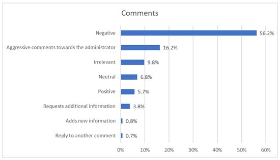 The results of the analysis of the tone of the comments reveal that the majority of comments are negative 149 (56.2%) (Figure 4). They are followed by aggressive comments towards the administrator of the page, which amount to 43 (16.2%), 26 comments (9.8%) that are considered irrelevant to the posted tweet, and 18 neutral comments (6.8%). The positive comments are merely 15 (5.7%), followed by comments that direct questions to the administrator of the page at a total of 10 (3.8%).