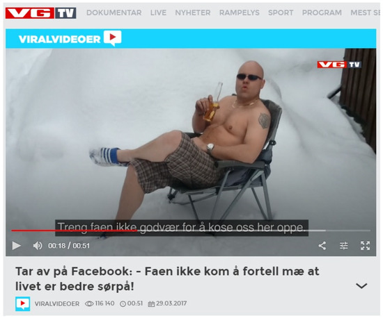 Figure 3 is a screenshot from a news story concerning a humorous video that had received a great deal of attention on Facebook. In it, a young man talks in a colorful dialect about how life in the northern parts of Norway is much better than in the south. He is wearing a beach outfit while surrounded by snow, and while he talks, he adjusts a beach chair and places it in the snow. This ironic video was posted in March when the Oslo-based newspapers usually report on the warm spring weather in the south, whilst the northern parts of the country are still covered in snow. The video plays to the time-honored antipathy between north and south in Norway.