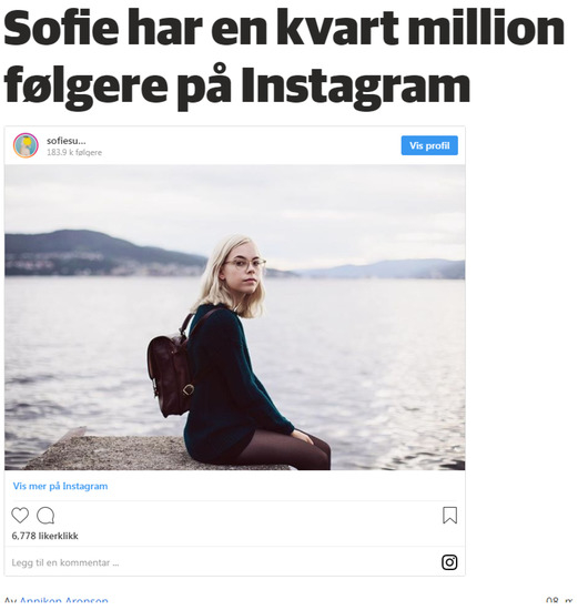 Figure 4 is a typical example of a media story from a regional newspaper (Drammens Tidende). The headline stated that “Sofie has a quarter of a million followers on Instagram”. The lead paragraph repeated this information but phrased it differently. The article contained an interview with her, and a few pictures from her Instagram profile, which consisted mainly of artistic fashion selfies.