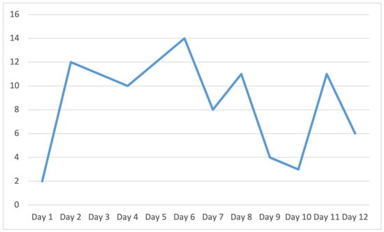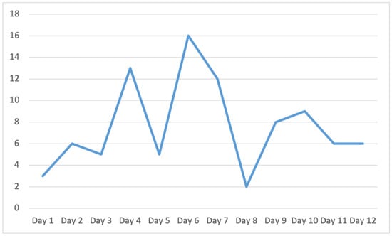 Between 24 February and 14 March 2022, the local newspaper Diário de Viseu published a total of 104 articles about the war in Ukraine. The coverage of the theme was more expressive from the second day on, and the peak was registered on the sixth day after the beginning of the war, with a decreasing trend from that date on, as can be seen in Figure 6. On the covers of the daily newspaper, the war theme was highlighted seven times as a headline, five times in a call-out format, and twice as a main photo.