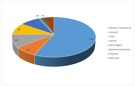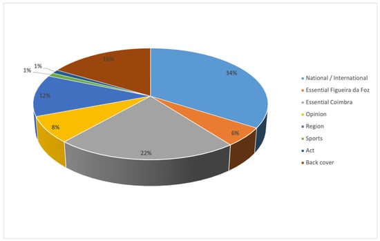 Considering the sections of the newspaper in which the articles related to this theme are published, it can be seen that many are paginated in the final section of the newspaper, with the name “National/International”. This section of the newspaper is commonly filled with brief news items, produced or copied from the main Portuguese news agency—Agência Lusa—as we will see later. It is also verified that the largest number of articles in this part of the newspaper appears in the very first days of analysis and in a final phase of this research, since, in the largest peak of articles about the war in Ukraine, the articles were allocated mainly in the “Coimbra Essentials” section, which is closer to the central pages of the newspaper and where the most prominent news and reports usually appear. It can be seen that this section gathers 22% of the total number of published articles. By looking at Figure 2, we can see that the articles are also distributed in other sections of the newspaper, although with less relevance, namely on the back cover, “Region”, “Opinion”, “Sports”, and “Take Action”.