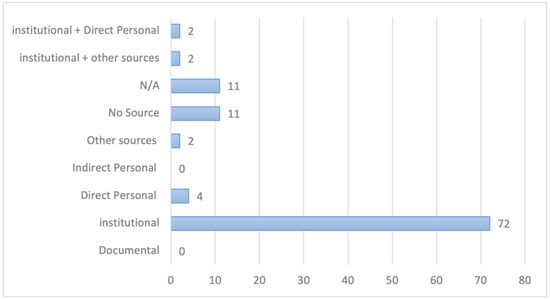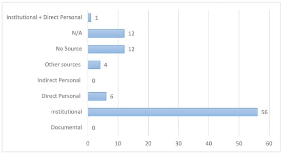 As for the type of information sources, as can be seen in Figure 9, the analysis of Diário de Viseu shows us that in 69% of the articles the sources used were institutional (n = 72). The direct personal sources are not well represented (n = 4) and appear in only 4% of the articles, one of which includes an interview. We should also underscore that in 10% of the articles analyzed there is no reference to any source of information, and we should also consider the opinion articles, where this categorization of sources does not apply.