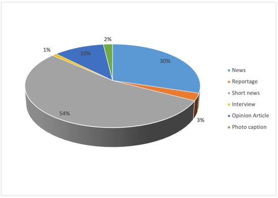 As far as the image category is concerned, only 33% of the 104 published articles are accompanied by a photo alluding to the sources or to the event. This data is related to the issue of journalistic genres, since 54% of the published articles are short news (n = 56), i.e., news texts with fewer than four paragraphs. The second most used journalistic genre is news (n = 31); on the other hand, there is little expression of reportage (n = 3). Through Figure 8, we can also perceive the small representation of the interview, which appears only once, having Major-General Carlos Chaves as the protagonist.
