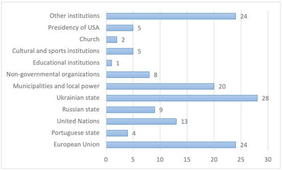 Anticipating a considerable use of institutional sources, similar to the data obtained in previous studies carried out in the local press (Midões and Martins 2020), this research also aimed to identify the main entities that assume the position of institutional sources and that are mentioned by journalists in the 56 articles where this type of source was used. Therefore, a more detailed analysis shows that municipalities and local authorities have a significant weight in this media outlet (n = 16), that is, in 28.6% of the cases. Even though the subject is of an international nature, involving Russia and Ukraine, the second most used category of institutional sources is the Portuguese State (n = 8); only then comes the Ukrainian State (n = 7), distanced from sources connected to the Russian State (n = 2). Figure 5 shows the distribution of these institutional sources by other entities linked to political parties, educational institutions, and the European Union, among others.