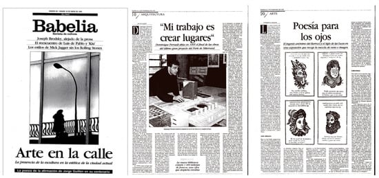 El País was the first of the three analyzed newspapers that founded its cultural supplement on 19 October 1991. At that time, the newspaper director was Joaquín Estefanía Moreira, and the editor-in-chief of culture was Rosa Mora; however, the director of Babelia is not indicated in the masthead. An example of Babelia’s layout in 1993 is shown in Figure 1. Currently, the editor-in-chief of the supplement is Guillermo Altares (the director of the newspaper’s culture section), and the current director of El País is Pepa Bueno Márquez. Furthermore, concerning the contents analyzed in this article, Bea Espejo has been, since the beginning of 2017, the editor-in-chief of the art section. An example of Babelia’s layout in 2018 is shown in Figure 2. The supplement is distributed weekly with the newspaper on Saturdays.