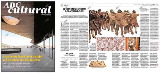 ABC founded its supplement on 8 November 1991. The first chief editor was Blanca Berasategui when Luis María Anson directed the newspaper and the supplement. An example of ABC Cultural’s layout in 1993 is shown in Figure 3. From 2021 onwards, the director of the supplement (and of the culture section of ABC) has been Jesús García Calero, and the director of the newspaper has been Julián Quirós. About the contents analyzed in this article, Javier Díaz-Guardiola has been, since the beginning of 2004, editor-in-chief of the art and architecture section. An example of ABC Cultural’s layout in 2018 is shown in Figure 4. The supplement is distributed weekly with the newspaper on Saturdays.