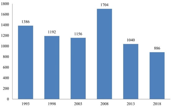 As shown in Figure 7, comparing the first data collected from 1993 with the latest from 2018, I verify that the number of pages has decreased considerably in Babelia. In 2018, the supplement had only 63.9% of its annual pages in 1993. The reduction of its extension was more gradual at the beginning and more dramatic in the last years, after the high number of pages published in 2008, when the supplement tried to recover its prominence. However, this heyday did not last long due to the Global Financial Crisis of 2008; in 2013, the number of annual pages plummeted dramatically to values lower than those of the previous five years: from 1704 pages in 2008, it dropped to 1040 in 2013. Further, it continued to fall in 2018 when the number of pages of the supplement reached the lowest annual number of all the years analyzed, only 886 pages.