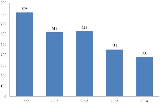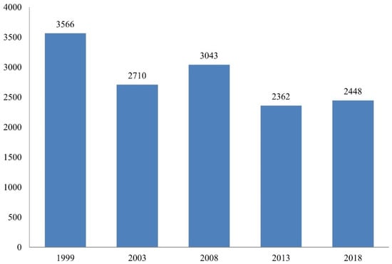 The annual number of pages of El Cultural has been reduced over the last two decades (Figure 9). In 1999, 3566 pages were published; in 2018, only 2448. In other words, the annual volume of pages in 2018 represents 68.6% of the pages published in 1999. This indicates a reduction of almost a third in the total length of the supplement. Throughout the period analyzed, the annual number of pages fluctuates, although not as suddenly as in Babelia or ABC Cultural. The most significant decrease was the one experienced from 1999 to 2003, with a difference of 856 pages. In 2008, the annual number of pages of the supplement rose slightly compared to 2003: it went from 2710 to 3043 pages. However, it dropped again in 2013 to the lowest annual number of pages of the years analyzed: 2362. Further, it was similar in 2018: 2448 pages.