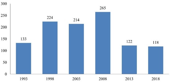 As shown in Figure 10, the evolution of the annual number of pages of Babelia’s art section increased considerably throughout the first two decades. In 1993, only 133 pages were dedicated to art, while in 1998, 224 pages. In other words, in five years, the extension of the art section nearly doubled. Even though in 2003, the annual number of the art section fell slightly (only ten pages less than in 1998), it rose again in 2008, reaching the maximum value of all the years analyzed: 265 pages. On the contrary, in 2013, the art section was seriously affected due to the significant reduction experienced by the supplement. The art section had only 122 pages, even less than in 1993. However, it was in 2018 that it reached the minimum value of all the years analyzed: only 118 pages dedicated to art.
