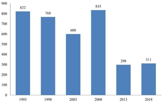 The length of the art section of ABC Cultural has changed in parallel with the supplement length. In its first lustrum, the number of pages gradually diminished. As shown in Figure 11: in 1998, the annual number of pages of the art section was 768, 54 fewer than in 1993, and 600 in 2003, 168 less than in 1998. On the contrary, the supplement experienced a significant increase from 2003 to 2008 that also had a substantial impact on the volume of the art section: in 2008, the art section reached the maximum annual number of pages of the analyzed years: 835. However, in the following five years, the decline is abysmal. For example, in 2013, only 298 pages dedicated to art were included. That represented only 35.7% of the annual number published in 2008, a little more than a third. Further, it was almost the same in 2018 when 311 pages dedicated to art were printed.